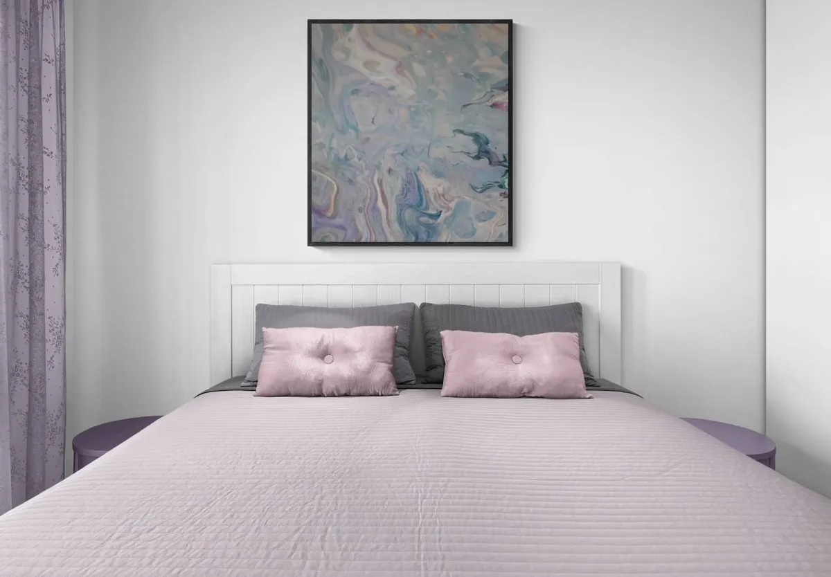 Handcrafted acrylic pour on 12" by 12" canvas. Base coat of painting is a black,navy and magenta mix. Colors over the base coats include: aqua, metallic pink, lavender, metallic purple, titanium white, magenta, iridescent gold, metallic cobalt blue and true blue. Gloss polyacrylic used to protect colors. Signed & dated on back.