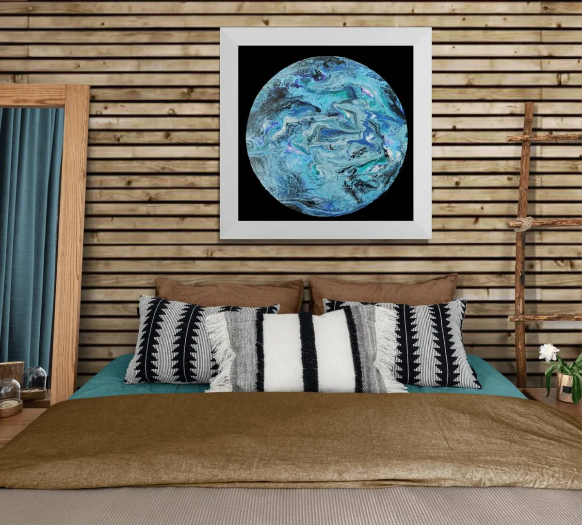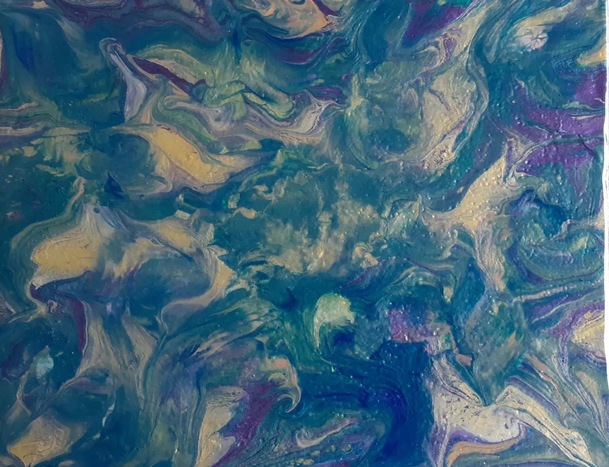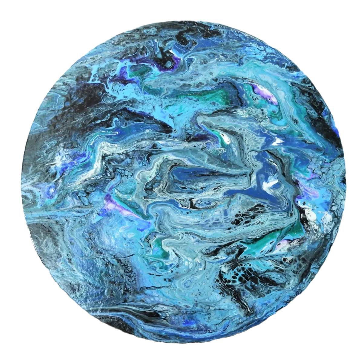 10" round acrylic fluid pour on high density fiberboard (HDF). Each piece is unique and unrepeatable. Two coats of clear gloss protective applied to protect the surface. It's difficult to show the true depth and texture of the actual work in a photograph. Signed & dated on back.