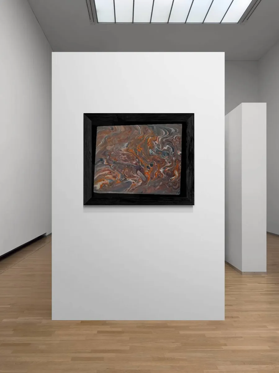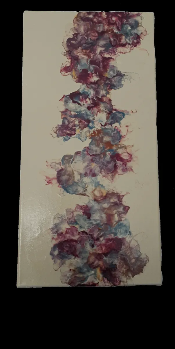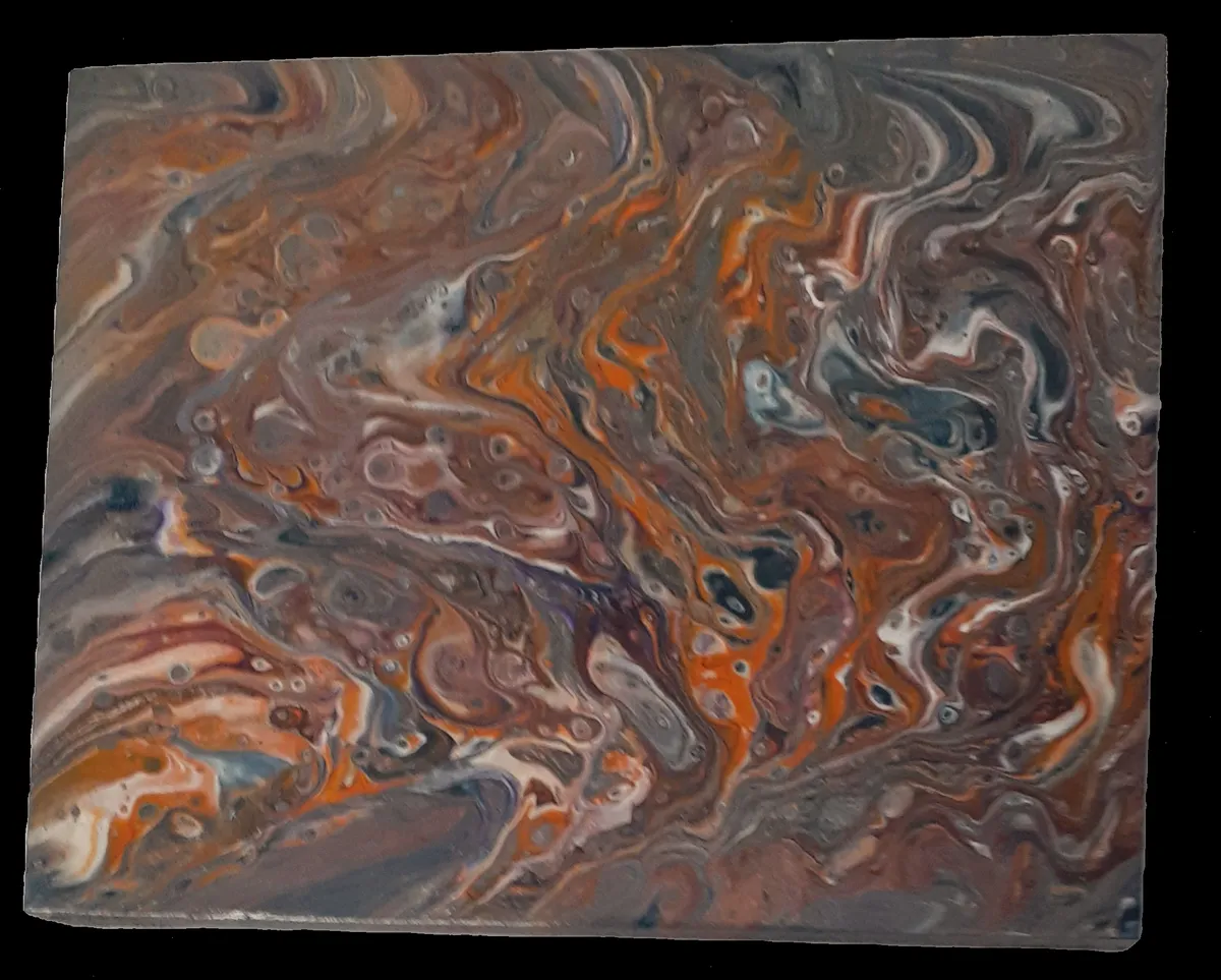 Handcrafted acrylic pour on 10" by 8" wood canvas. Created using orange, reds, purple, gold, silver magenta, blues and white. Protected with gloss polyacrylic. Signed & dated on back.