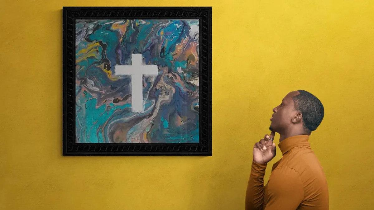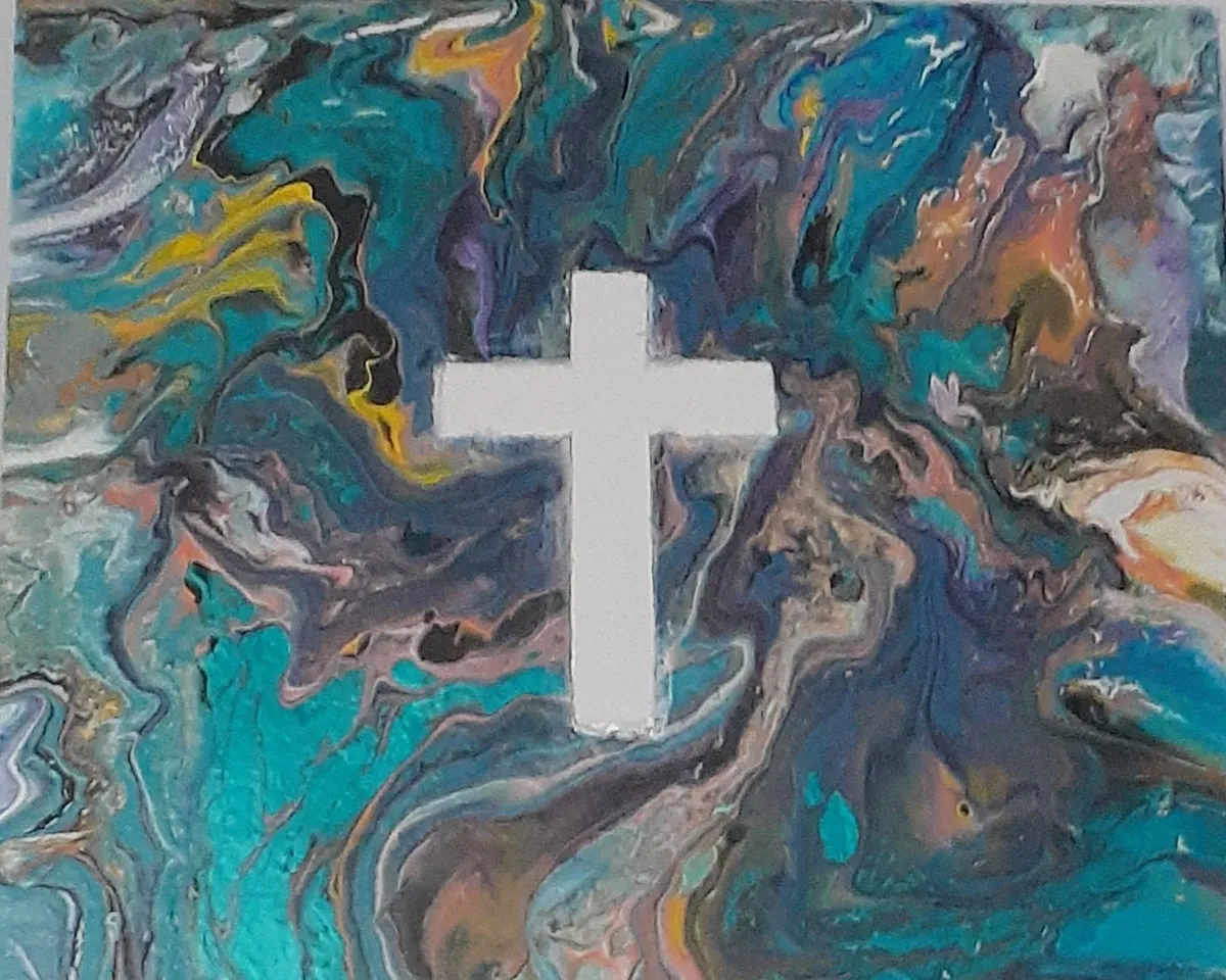 Handcrafted acrylic pour on 8" by 8" wood canvas. This canvas was created in two separate steps and has vibrant colors with brilliant white cross. Wood canvas has two coats of Epoxy Resin applied to protect the colors. Signed & dated on back.