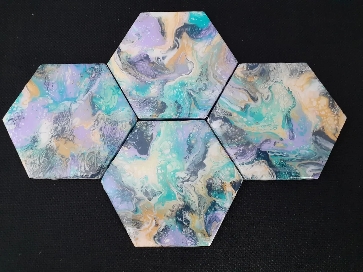 Handcrafted acrylic pour on 4" by 4" hexagon tiles (set of 4). Soft, muted colors include: white, aqua, green, lavender and gold. All tiles have cork backing to protect furniture from scratches. They also have epoxy resin to protect the colors. Signed & dated on cork backing.