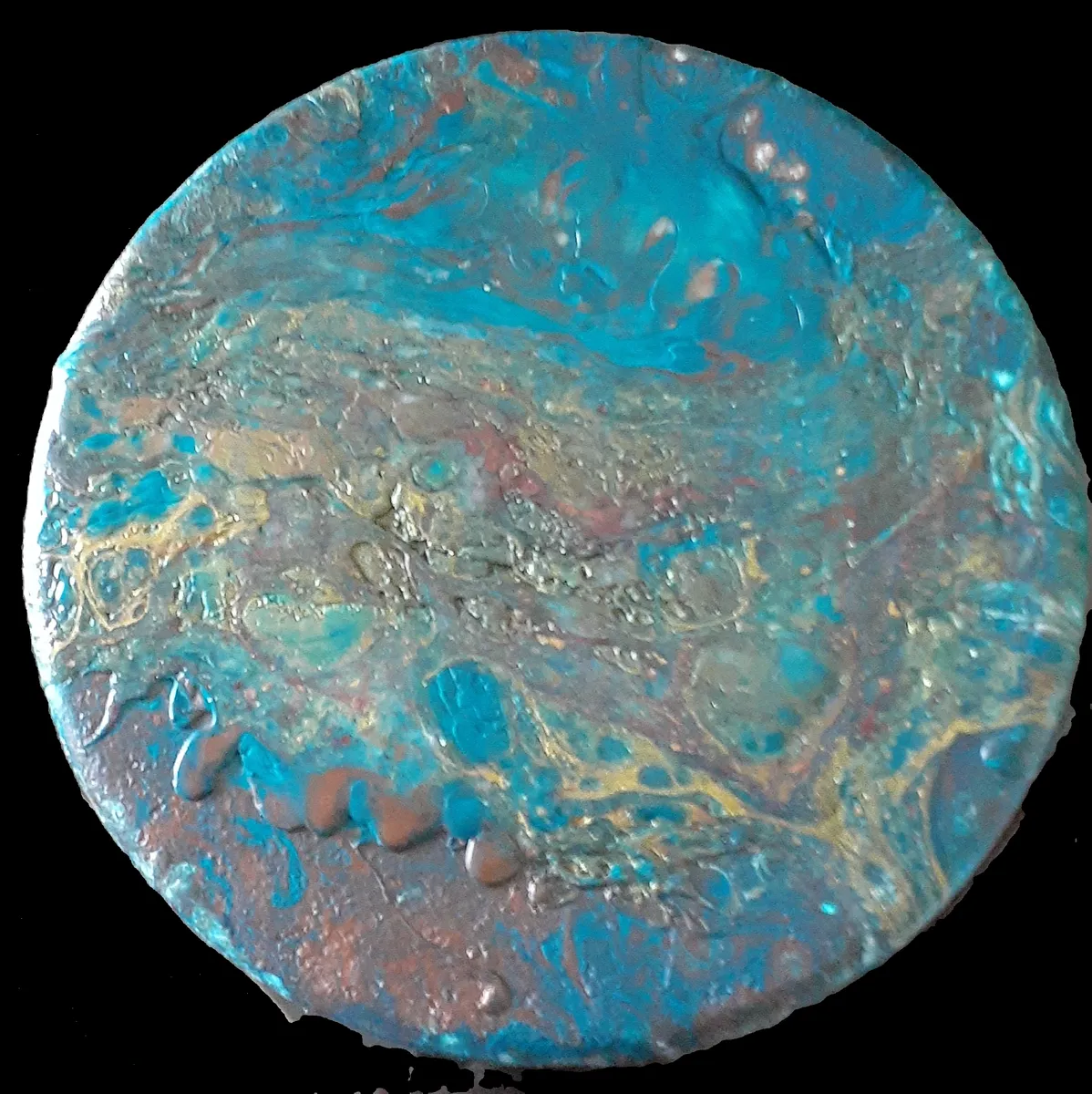 This decorative plaque has the same color scheme as the 12" by 12" canvas. The acrylic paint is also mixed with epoxy resin. The way the acrylic/ epoxy was poured gives this piece a textured look and feel. Colors used are: Turquoise, Aqua Green, Metallic Antique Copper, Metallic 24K Gold and Metallic Garnet. Signed on the back of cork.