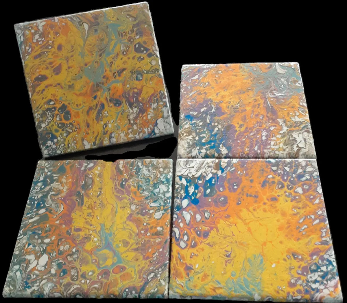 6" x 6" ceramic tiles (Set of 4) are made with the same color scheme. Each piece is a unique combination of teal green, bronze, magenta, gold, navy blue, orange, yellow and white. Cork on the backs to protect your furniture. There are two coats of polyacrylic sealer on each tile to protect the colors. These pieces were created using a fluid art technique and are not reproduceable. Signed & dated on cork backing.