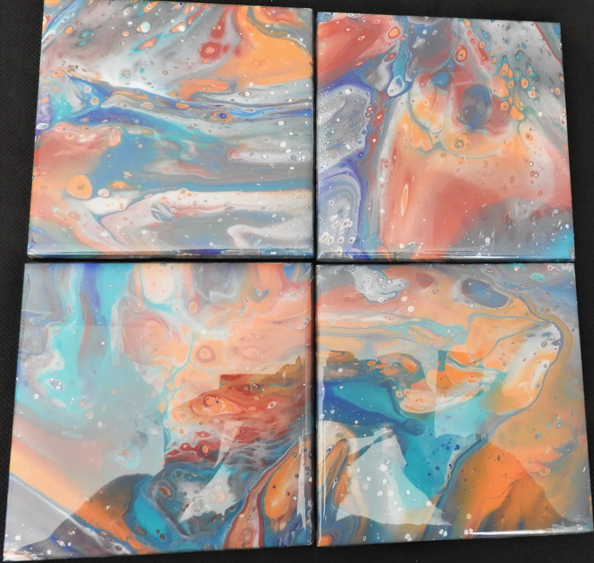 One-of-a-kind (set of 4) 6" by 6" ceramic tiles made with the same color scheme. Bright and cheery combination of oranges, reds, blues, aquamarine & purples. Two coats of epoxy resin applied to each tile to protect the colors. These pieces were created using a fluid art technique and are not reproduceable. Signed & dated on cork backing.