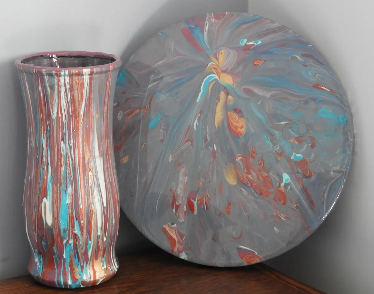 Handcrafted acrylic pour on a glass vase and round canvas. Color combination: blues, gold, red, white, and purple. Measurements of vase: 8.5" x 12" round (at largest point) and 3.5" wide top. Measurements of matching canvas is 10"x10". Epoxy resin applied to vase and canvas to protect them . Pieces are one-of-a-kind and not reproduceable. Signed & dated on back of canvas.