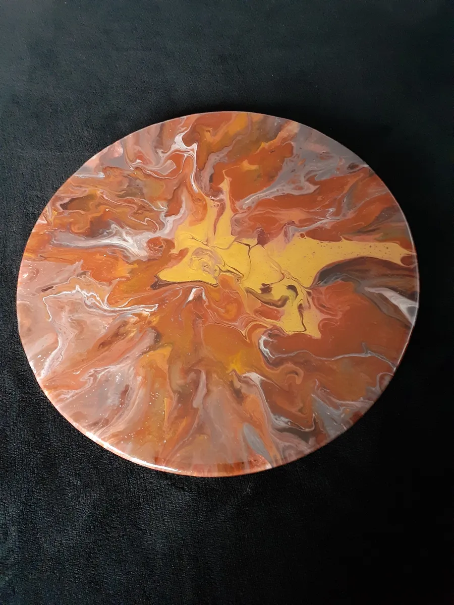 This beautiful Lazy Susan turntable is handcrafted (by my hubby) with pressed pine. Circumference:13" Hand poured with acrylic paint medium. Acrylic colors are: chocolate brown, iridescent pearl white, burnt sienna, Golden azo, iridescent precious gold, deep peach and 24 K gold. After the paint cured, applied 2 coats of epoxy resin (food safe) to protect the colors and for easy cleanup (just use damp clothe). Created in a non-smoking home. Unique and cannot be reproduced. Con-Tact Grip Liner used on base bottom. Signed and dated on back. If you would like a custom-made Lazy Susan turntable, please message me.